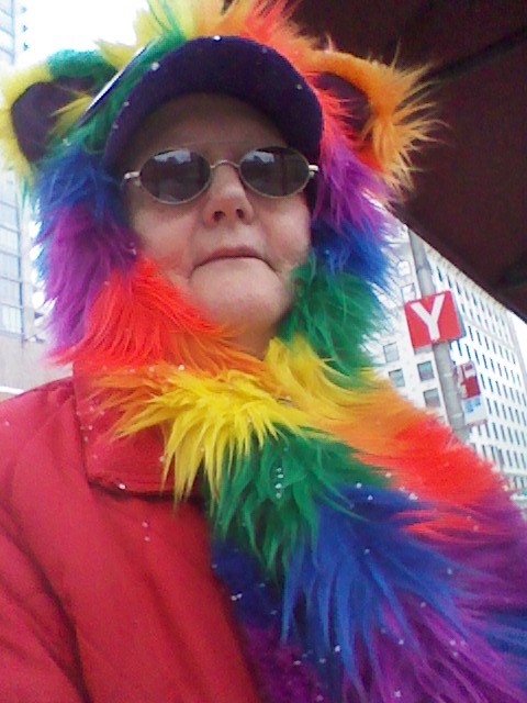 When I choose to wear it, I instantly relax and become happy. I wore it today with black jeans, slipped on my red coat, Pride Bear Spirithood over purple visor (with bling, of course), and out the door I went.